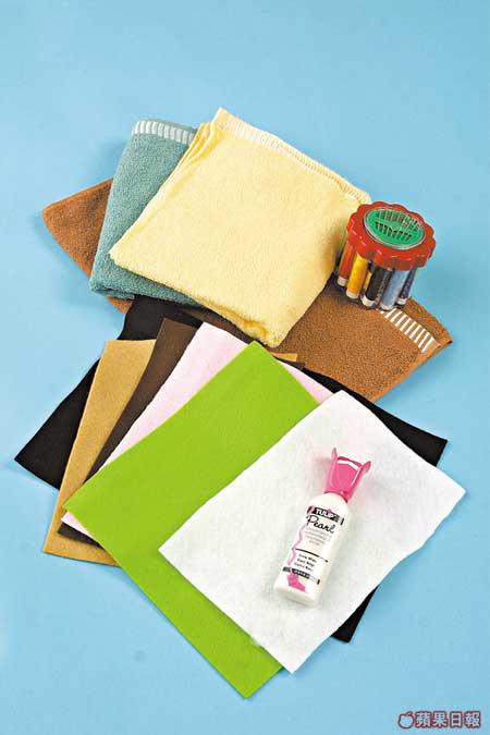 材料:毛巾1條(約$8)、絨布(深啡、淺啡、黑及白)各1塊(每包$5)、布料專用膠水1支($40)。