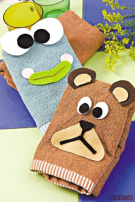 浴室最常用的便是毛巾,就先從毛巾着手吧!一於加點花巧,吸引小朋友的注意力。小朋友最愛卡通動物,家長可將毛巾「扮成」不同的動物,將毛巾打扮成熊仔或青蛙,只要自行繪畫圖案,再貼上絨布便可,方法簡單,效果唔錯㗎!