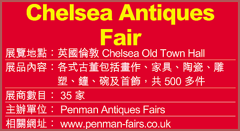 主辦單位表示,Chelsea古董展是給想投資古董的人士一個最佳機會,藉此認識各種古畫、家具、陶瓷、雕塑、鐘、碗及首飾等,展場上的古董,來源不僅是英國本地,許多產品來自歐陸各地,包括法國、德國及意大利等,甚至有來自印度、日本及中國的。