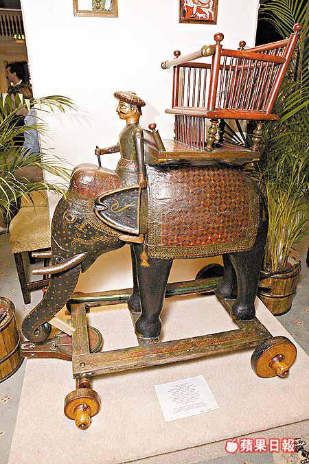 由於印度曾是英國統治的地方,因此這個在英國舉行的古董展覽會,也可看到許多有關印度的東西,其中有隻1860年於印度製造、大象造型的兒童座騎,是此次展出中的非賣品。這隻大象高1米多,前面還有駕駛者,小朋友坐上去,就可感受到高高在上的感覺。