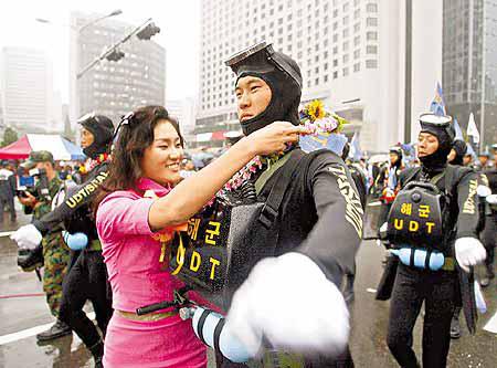 總統盧武鉉在首都漢城城南機場冒雨檢閱了三軍軍備,看過士兵跳傘、游繩和跆拳道碎磚表演後,六千多名士兵巡遊往市中心。人們的焦點都集中在多款高科技武器上,像法國製流動導彈和南韓自製巡航導彈,以及首次展出的「突眼」導彈。這款由以色列設計的光電制導導彈,射程逾一百公里,南韓去年部署了多枚來針對北韓的導彈和主要軍事基地。