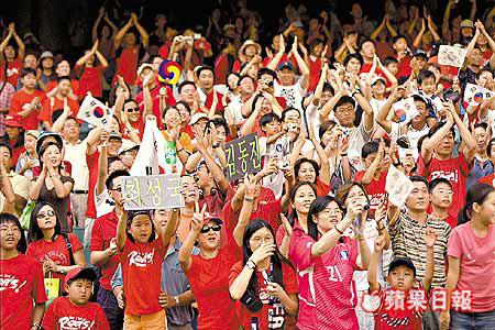 儘管香港佔得主場優勢,但實際上昨午入場的球迷,接近一半為居港的南韓僑民,他們清一色地穿上「Bethereds」紅戰衣,並帶備大鑼大鼓進場為客軍打氣,換言之香港這種「人和」優勢實際上是名存實亡。
