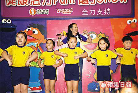 莫文蔚(Karen)昨日穿上卡通公仔T恤,到屯門出席「健康活力Fun體Show」活動,其間更與一班小朋友跳雞仔舞,可愛的小朋友逗得她開懷大笑,而她看見心愛的卡通人物出場時,更興奮得熊抱公仔。