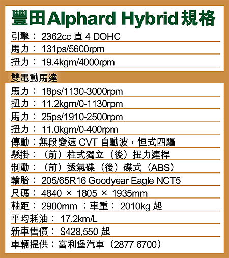 近年對汽車環保研究不遺餘力嘅日本豐田車廠,繼早前代理運嚟全新第2代Prius環保Hybrid轎車抵港後,原來近年城中炙手可熱嘅豐田Alphard豪華MPV,廠方亦推出環保Hybrid型號,新車唔止設備齊全又講究,每公里平均耗油量以廠方提供嘅17.2km/L推算,亦不過為$1.5而已,絕對稱得上係慳油呢!