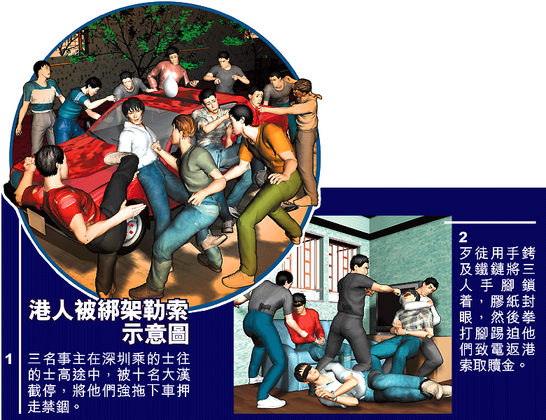 其中一名事主李先生昨日表示,他們被歹徒由九月二十八日凌晨擄走,直至二十九日凌晨才能脫身。其間曾被歹徒用手銬和鐵鏈鎖住手腳,並被人用膠紙蒙眼。歹徒在擄劫事主時,在的士上又故意露出兩支手槍作威嚇,被禁錮期間,三人遭不同程度毆打,迫令他們打電話回香港,向家人各索款十萬元。在禁錮之際,事主又聽到歹徒說「又挾到兩個啦」,因此估計當時還有另外兩名港人被這幫歹徒以同樣手法綁架勒索。