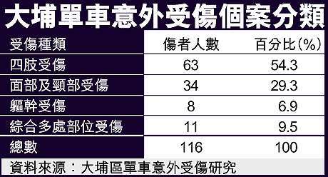 由大埔那打素醫院急症室醫生進行的調查,分析了在○○年九月底至十二月初的六十六天內,因為單車受傷而求診的一百一十六名傷者,當中六成二是男性傷者,女性佔三成八。接近五成傷者在求學階段,其中以男學童受傷情況較普遍。