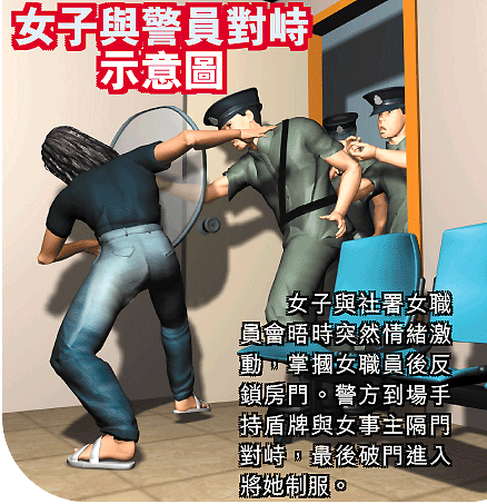 昨日下午三時許,女事主走到馬鞍山新港城C座地下的社署家庭服務中心投訴。當時由三十六歲姓馬的女職員,與她在一個房間內面談,向她解釋如何分配綜援金雙方早有協議。據悉,女事主突然情緒激動,向女職員左邊面頰掌摑了一記耳光。其他職員發覺企圖進入阻止時,女事主突然將房門反鎖,職員報警。