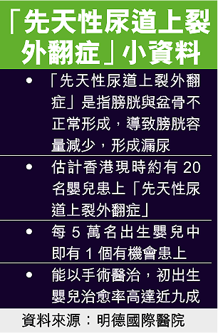 明德國際醫院泌尿科顧問醫生顏獻基昨在記者會上表示,「先天性尿道上裂外翻症」是一種先天性缺陷,因胚胎發育時膀胱與盆骨的不正常發展而引起,令膀胱容量減少,出生嬰兒不懂「尿急」而造成漏尿、失禁情況。他表示,部份患上該症的男性,陰莖可能會不正常形成而縮在盆骨內,從而影響長大後的性生活。
