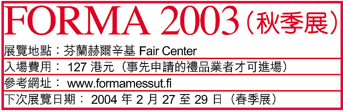 不過,在海外市場的開拓方面,就沒有如此樂觀。根據芬蘭進口商Kaira經理JuhaKaira表示,過去每年下半年都前往香港、中國等地與廠商接觸,今年受戰爭、SARS等因素影響,截至目前為止,他尚未到過亞洲,定單明顯受到影響。