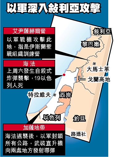 以色列為報復巴勒斯坦人上周六在海法市發動自殺式炸彈襲擊,周日凌晨派戰機闖入敍利亞首都大馬士革附近,空襲巴人激進組織訓練營。這是以色列近二十一年來首次犯境襲擊敍利亞領土,令人憂慮持續了三年的以巴流血衝突會擴及鄰國。敍利亞即日致函聯合國投訴,要求安理會立即討論。