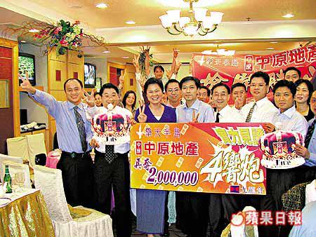 中原地產上月大豐收,住宅同工商舖部門佣金收入近一億四千萬,公司早前定下佣金逾一百萬嘅組別,可以攞到五千至兩萬蚊獎金。中原董事總經理黃偉雄講,有近四十組攞獎,當中八組過二百萬,最高佣金嘅一組係西半山輝煌臺分行,有三百八十萬,重係唯一過三百萬佣嘅組別。