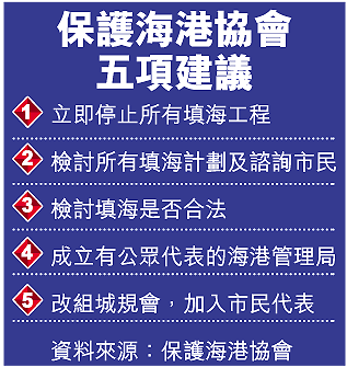 保護海港協會主席徐嘉慎及中西區保護海港行動發起人郭家麒,昨與房屋及規劃地政局局長孫明揚進行歷時一小時的會面。徐嘉慎會後表示,他向孫明揚提出了五項建議,包括立即暫停所有填海工程(包括挖淤泥)、進行全面檢討填海計劃及諮詢民意,以及成立有市民參與的海港管理局等(見表)。