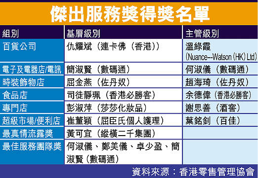 「視客如友」可為服務業的不二法門。獲頒「最佳服務團隊獎」的數碼通電訊有限公司推銷員簡淑賢指出,身為前線服務員最重要是「做好自己本份,當顧客係朋友,耐心咁幫佢哋,令到顧客感到有賓至如歸嘅感覺。」