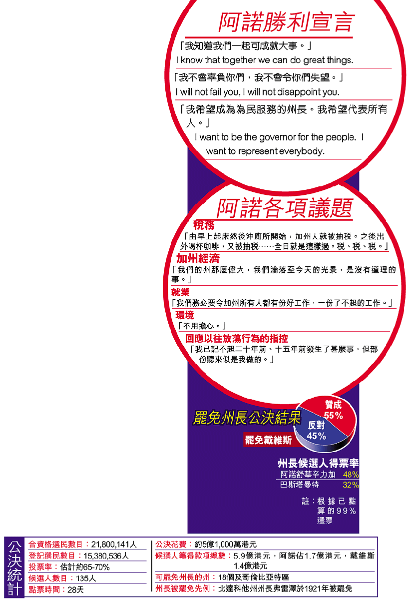 憑着名氣、電影中打不死的戰士形象,荷李活「大隻佬」明星阿諾舒華辛力加(ArnoldSchwarzenegger)俘虜了美國加州選民的心。在周二公決中,他成功爭取選民罷免原州長戴維斯,擊敗對手,當選州長。比媲前總統列根的足印,他由星光大道踏上政途,搖身成為美國政壇的「超新星」。他承諾:「我不會辜負你們,不會令你們失望。」