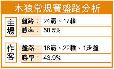 木狼客途表現認真麻麻,贏盤率不足四成半,尤其作客強隊時盤路表現更為不濟;如在受讓四至七分的十二場作客戰中,有八場屬於輸盤,捧場客有超過六成半機會損手,下次看見木狼在這受讓範圍內的作客賽事,大家記得買對家喇!