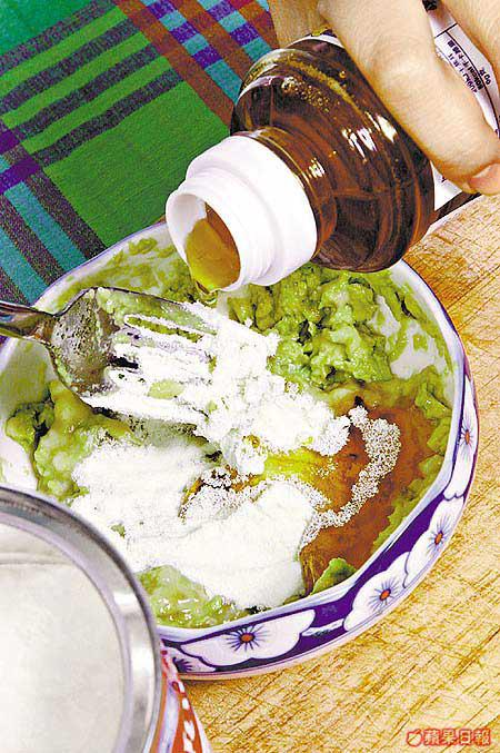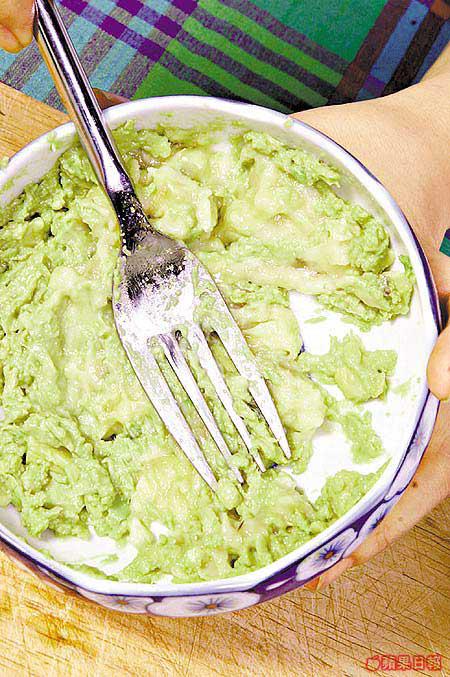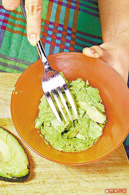 要成功將牛油果肉搗爛,可能你會覺得有點難度,其實可以從兩方面入手。一是選擇較成熟的牛油果,選擇時按一按其果蒂部份,腍即代表果肉成熟,搗爛時會較易。另外你可試試用攪拌器將牛油果搗爛,不過我卻嫌做完面膜還要洗攪拌器,太浪費時間。我建議將牛油果切碎後用叉將其壓爛,或者把果肉放進密實袋,將袋真空密封,然後用玻璃樽在袋面滾動直至壓爛為止,方便又夠「爛」,絕對是偷懶的最佳辦法。
