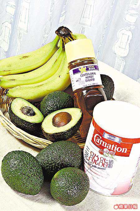 材料:牛油果半個、香蕉半條、脫脂奶粉2湯匙、蜂蜜半茶匙