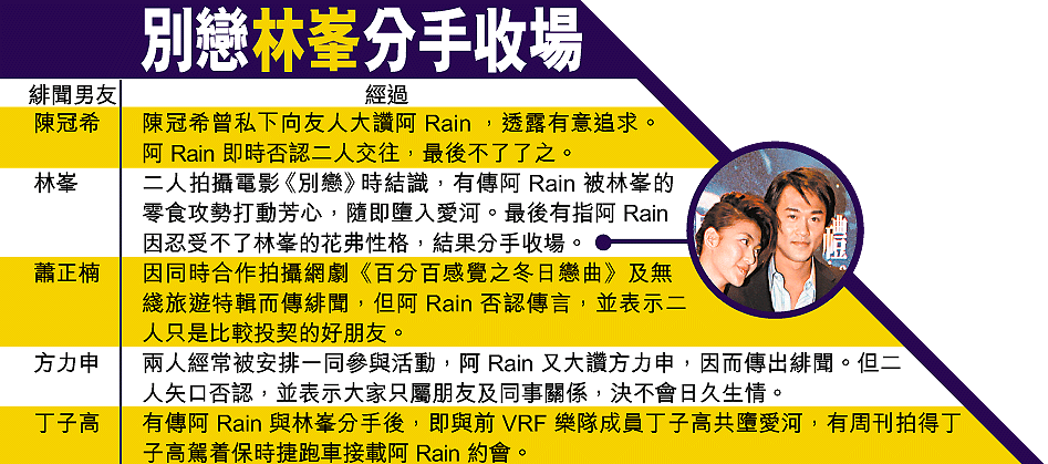 與林峯分手後的李彩樺(Rain),雖然被傳與方力申交往,但原來真命天子另有其人,就是前VRF成員、富家子丁子高。阿Rain前晚與丁子高不避嫌地逛街和食雪糕,看來二人已發展到可以公開戀情的地步。