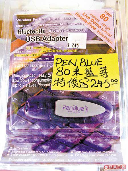 要喺屋企整個無線網絡,點計都要7、8嚿水,用藍芽代替就更抵玩,尤其已經唔少PDA、手機、甚至相機已經內置藍芽,安裝容易嘅藍芽USBDongle自然更搶手。隨便問吓店員有邊隻好介紹,就有5、6款推介,價錢都差唔多,較平就有呢款PENBLUE,$245有交易。