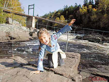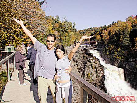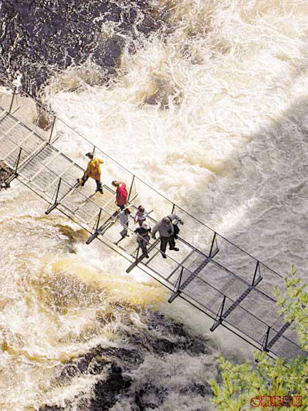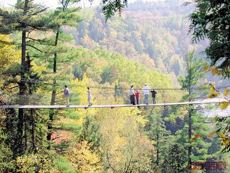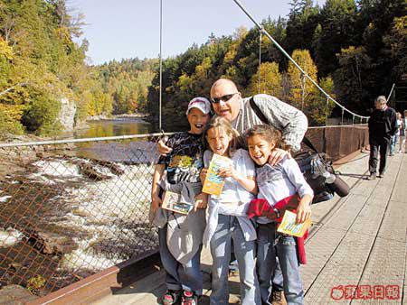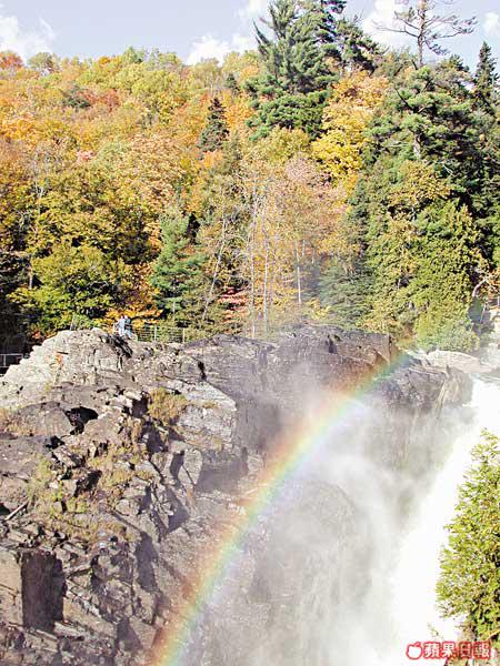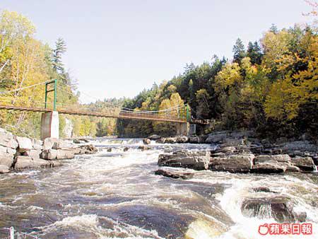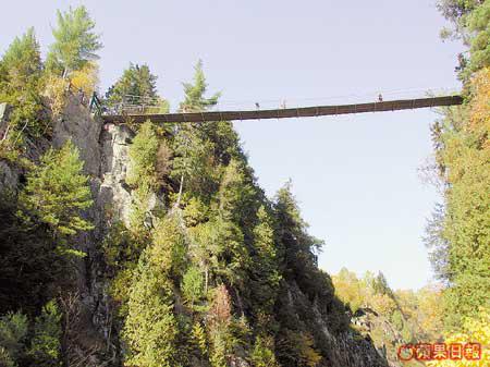 魁北克市的秋天是個童話世界,蹓躂於石板路上,就如漫步在法國小鎮,很是浪漫。但街上賣畫的老伯卻告訴我一定要到郊外走走:「那兒的瀑布比尼亞加拉大瀑布還要高呀!」不會自己開車,幸好酒店幫我找到一間旅行社,可到魁北克的大峽谷Canyon探險。這個名為Canyon的地方,是片大森林,有山有水,紅橙黃綠混在一起,由於位置偏北,顏色要比昨天看的更精采。Canyon最出名是山谷間的瀑布,而連接兩山之間有三條高度不同的吊橋,最高最長那條距水平線足足有近60米,加上位處瀑布和陡壁中,畏高的膽小的恐怕都會臨陣退縮。而我?簡直超級興奮啦!