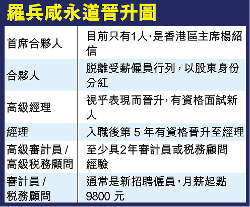 羅兵咸永道人力資源及發展高級經理葉文珊表示,每年會按員工所處理的項目表現來評分,檢討薪酬增加幅度。若員工在會計師專業資格考試及格,也會獲額外加薪。 晉升方面,通常入職5年可升至經理,但近年也有表現優秀的員工,入職4年已升至該職,翌年更被調往美國工作。至於老闆級的合夥人階段,最少需要10年。