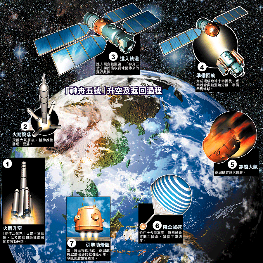 神舟五號今日進入太空後,計劃環繞地球飛行十四圈,每九十分鐘一圈,歷時約二十一個小時。其間,太空人只會留在面積只有五點五平方米(約六十平方呎)的返回艙,安坐在座椅上,透過視像電話,與家人及中國領導人通話,也會以攝影機拍攝太空景觀和指定目標。他使用的攝影機主要用於軍事偵察,對地面目標分辨率達一點六米。