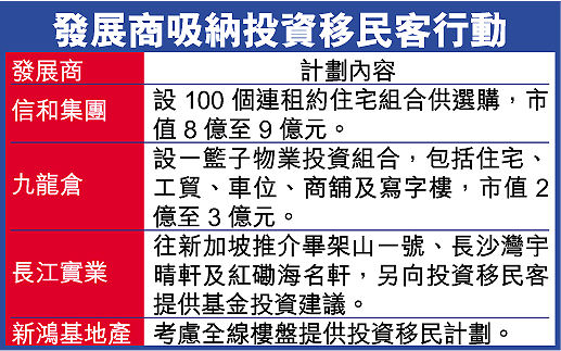 【本報訊】政府公布的投資移民政策,為地產市場製造不少商機。各大發展商相繼推出物業投資組合,向投資移民客招手。繼九龍倉(004)後,信和集團亦制訂同類投資物業計劃,將旗下市值8億至9億元的6個收租住宅物業,售予投資移民客。若透過利嘉閣地產選購信和旗下樓盤,享投資移民服務及優惠。