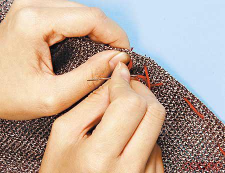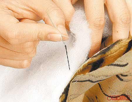 3將開口位的布邊摺上約1cm,然後縫好,以免披口。要令坐墊更舒服,不妨加上一塊18吋闊、20吋長的夾綿,將多餘的夾綿一併縫在椅墊前端的底部位置,這讓坐時連膝頭內側也感覺到軟墊,感覺較舒服。