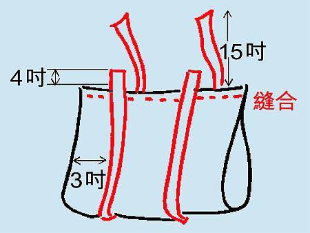 2要將雜誌袋掛在椅背上,今次便選用絲帶,不妨在雜誌袋的兩側(袋邊對入約3吋位置),縫上絲帶,記緊絲帶兩端一邊要預留15吋長,另一邊則留4吋的絲帶以掛在椅背上。