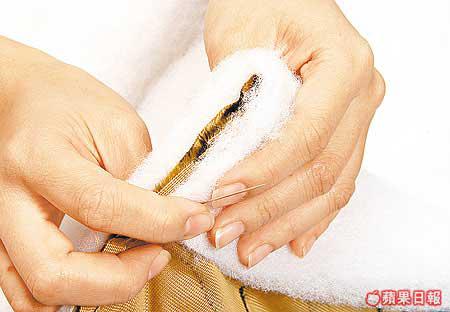 3為了讓椅背更軟熟,剪一幅與椅背同等大小的夾綿,然後沿着布邊縫在布套內。最後在開叉位置貼上魔術貼便可。