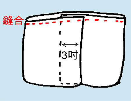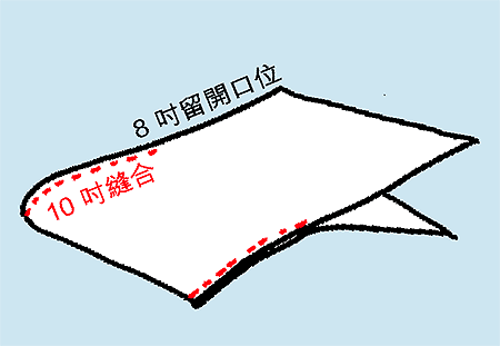 2將剪下的布匹對摺,然後將兩側用針線縫好。由於摺椅兩側有椅腳位置,所以縫時記緊要預留開口位。(參考:對摺後布匹變成18吋×18吋,開口位置深約8吋,所以只需縫合兩側約10吋的部份。)