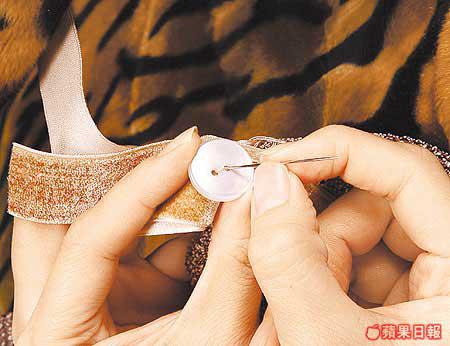 3將長的那端絲帶掛在椅上,然後把絲帶的頭尾兩端互相重叠,底的那條絲帶縫上鈕扣,面的那條則用剪刀剪開約2cm的窿以作鈕門之用。將雜誌袋固定在椅背上便完成。