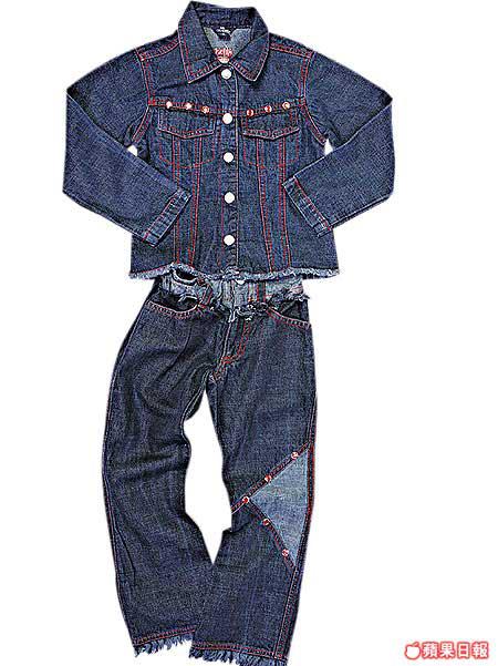 女孩服飾一向花款多多,至有型格非這套牛仔裝莫屬,深藍色牛仔布配上紅色膠珠,設計緊貼潮流,衫腳、褲腳玩披口,盡顯牛女風格。