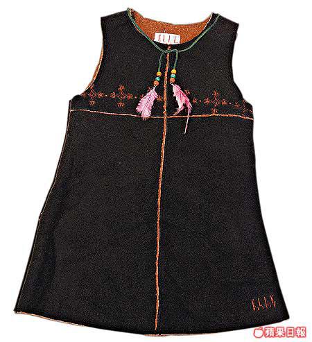 ELLE這件背心裙屬上季款式,內裡是極暖的羊毛,深啡色絨布驟眼看似皮料,領位綁上麖皮珠仔頸繩做配襯,幾有民族Feel!