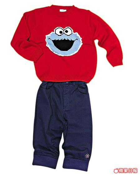 這件針織冷衫,心口一大個CookieMonster,屬搶鏡之選,鮮紅色冷衫最好襯條深色褲,CHICKEEDUCK這條全棉長褲會是不錯的選擇。