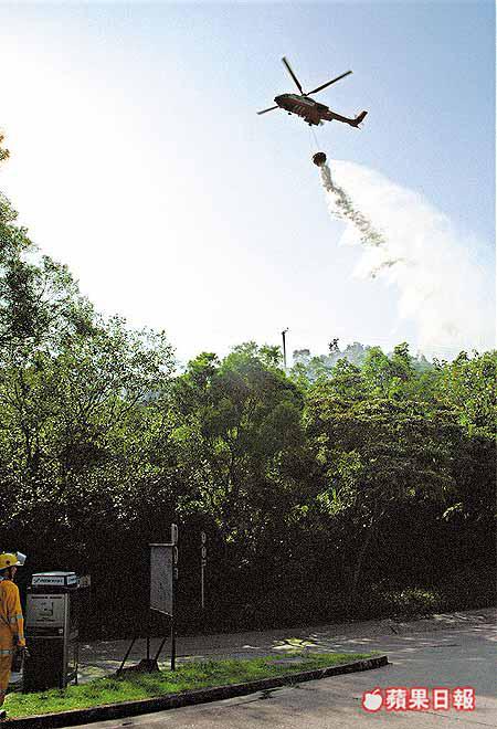 【本報訊】昨日風高物燥,天文台發出黃色火災危險警告訊號。中午十二時許,馬鞍山郊野公園近大水坑對上山坡發生山火,當時相對濕度只得百分之五十八,火乘風勢迅速蔓延(圖一),火場面積達二百米乘四百米,飛行服務隊直升機到場投擲水彈(圖二),三小時後將火撲熄。 文兆麟攝