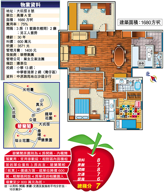 中原區域經理曾永生說,碧蘭閣低層B室,於今年6月樓市低潮時以450萬元成交,面積1680方呎,呎價僅2679元。近期市況好轉,叫價回升,除介紹的這個單位外,該盤尚有一個中層連租約單位放售,叫價640萬元。至於柏麗園同類千六呎4房單位,叫價800萬元起。