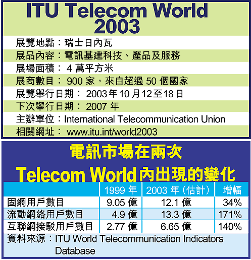 由聯合國屬下的InternationalTelecommunicationUnion所舉辦的ITUTelecomWorld2003展覽,是業內人士與各國政府電訊部門人員聚首共商電訊業發展的高峯會,同時是讓業內人士展示最新科技及產品的競技場。
