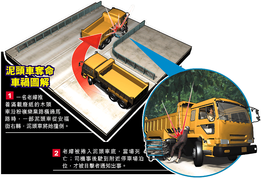 昨清晨七時許,鄧婆婆如常推着放滿廢紙的木頭車,沿樂業路前往聯和墟變賣廢紙。當她推着木頭車橫過安福街路口時,被一部沿安福街駛出右轉入樂業路的空載泥頭車撞倒輾過身體,當場重傷昏迷地上。現場消息稱,泥頭車撞倒人後未有即時停下,繼續開行駛入現場對面一個露天停車場泊位。一名男子剛巧踏單車途經,目睹意外發生,立即進入停場車通知泥頭車姓梁(五十八歲)司機發生意外,並致電報警。