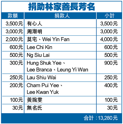 林家四口月前遇上車禍,四十二歲的林先生與八歲長子僥倖逃過大難,三十三歲的林太與五歲幼子身受重傷,幼子已於早前出院,林太則仍然留醫。林先生失業多月,僅靠妻子任職文員維持生計,如今復工無期,林家面臨破產危機。蘋果基金早前曾撥一萬元緊急援助金予林先生,近日另將善款合共一萬三千二百八十元交他簽收。 捐款編號:C1035 暖流熱線 電話:29908688 傳真:23702192 電郵:[email protected] 網址: http://www.charity.atnext.com
