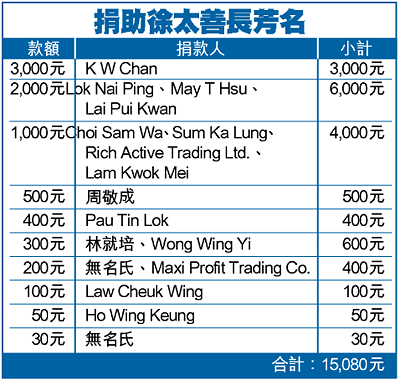 四十歲的徐太與丈夫育有兩子兩女,年齡十一至十六歲,由於丈夫收入微薄,徐太與子女雖已有居港權,仍留在內地生活以節省開支。月前其夫不幸心臟病發,需要長期療養,徐太遂與子女返港生活,因尚未住滿一年而無法申領綜援金,生活陷困。 蘋果基金曾撥一萬元予她,近日另將讀者捐款一萬五千零八十元交給她。 捐款編號:C1024 暖流熱線 電話:29908688 傳真:23702192 電郵:[email protected] 網址: http://www.charity.atnext.com