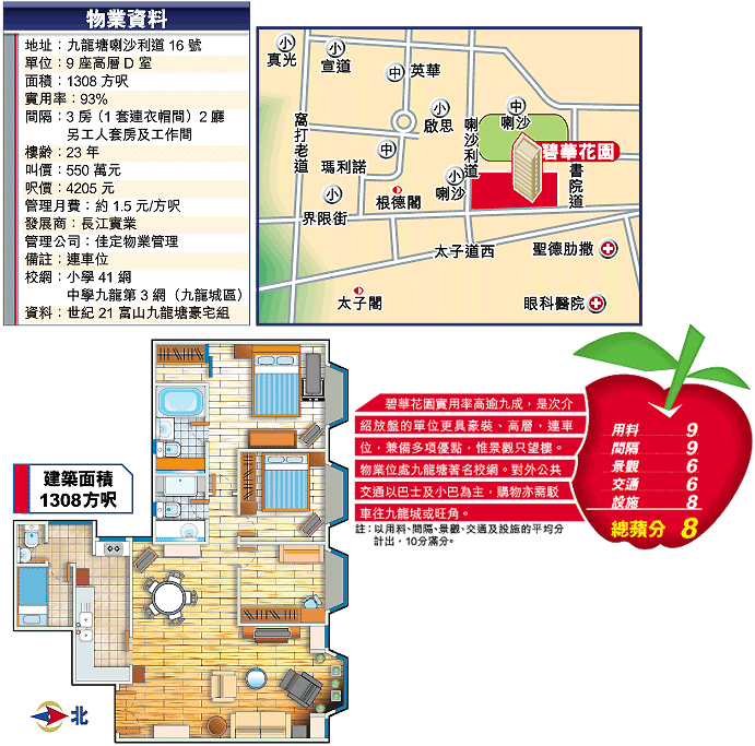 九龍塘碧華花園共有10幢住宅大廈,分前後排建於界限街與喇沙書院之間,單位面積分兩類,A及B室面積1742方呎,向喇沙書院球場或界限街,普遍叫價逾600萬元;向內園望樓景的C及D室,面積一律1308方呎,放盤價逾400萬元,是次介紹的是近期唯一的高層盤,附豪華裝修,還罕有地連車位出售。