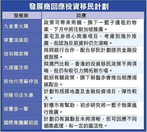 另外,華人置業(127)董事助理凌緣庭說,集團的豪宅及非核心商業項目,亦適合投資移民人士,會考慮與中原合作進行海外推廣。但她指出,目前的政策未夠清晰,例如批核時間、詳細的審批條件等。
