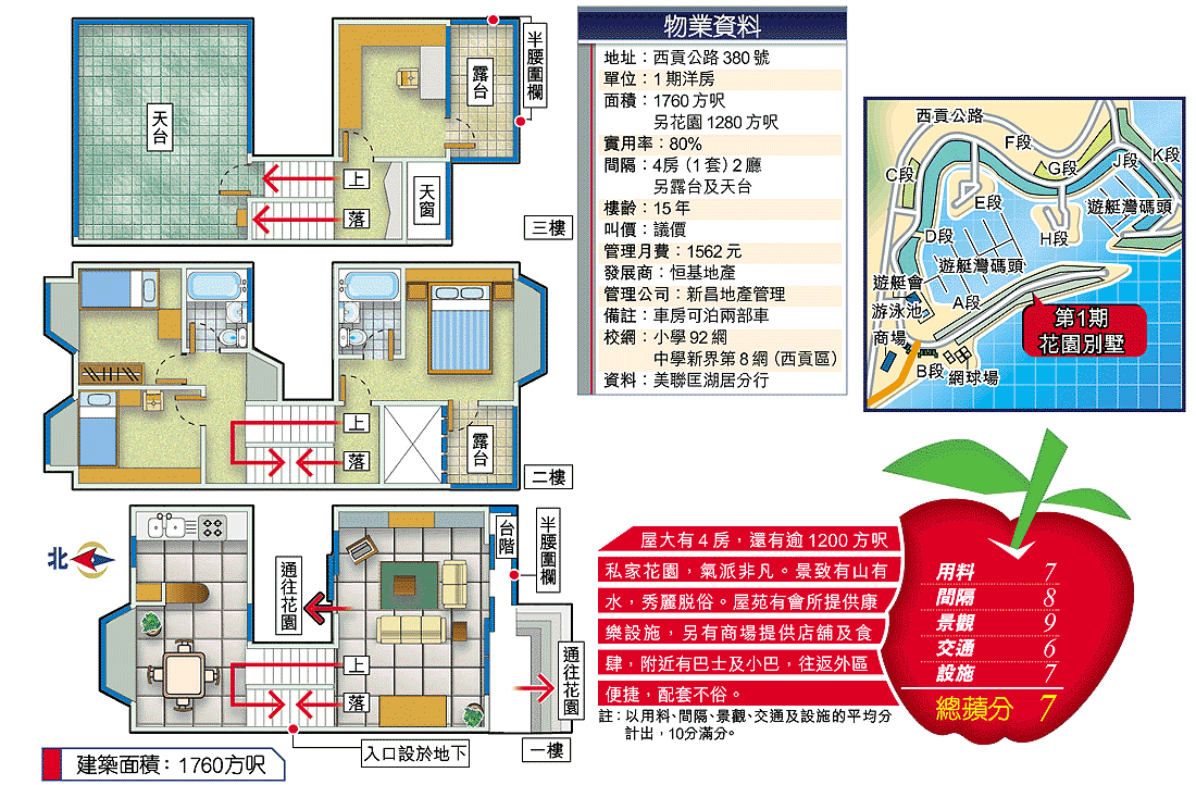 同類成交有1期雙數屋,面積1760方呎,花園1062方呎,連租約,造價偏低,8月以580萬元易主,呎價3295元。
