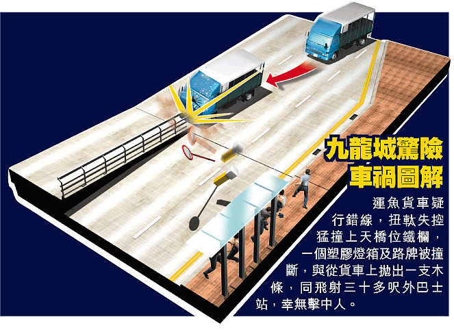 現場為太子道東西行線近舊機場,一條通往旺角的行車天橋上橋位位置。昨午三時許,溫駕着貨車與跟車沿太子道東慢線西行,當駛至上址時,司機疑察覺行錯線,扭右軚擬出中線上天橋時,失控撞向路中天橋鐵欄起端,撞毀一個塑膠燈箱及一個用鐵柱支撐的路牌後,車頭直撞鐵欄才停下,司機受傷被困,跟車工人則無恙,而燈箱及路牌被撞毀後,隨即飛彈三十多呎外一個巴士站對開路面,肇事貨車車尾一支木條也在猛烈撞擊中甩出,飛射巴士站對開,當時站內有約十名市民在等巴士。