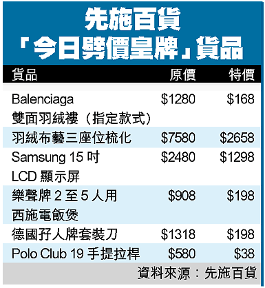 除了「每日劈價皇牌」貨品外,先施百貨尚會推出一系列的其他精選減價貨品,包括男裝、女裝、皮鞋、手袋、童裝、家具、家庭電器等,購買這類減價貨品,毋須事前「攞籌」。