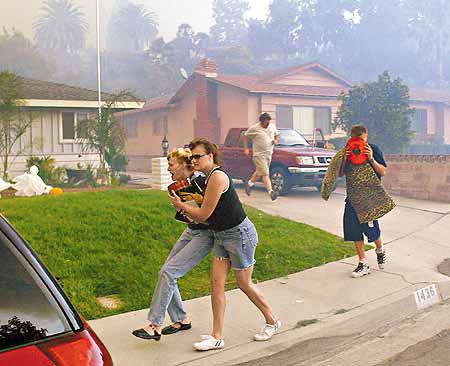 荷李活所在地、擁有大量豪宅的洛杉磯周邊四個衞星城市中,二千多間房屋正受到大火與濃煙威脅。在洛杉磯西北面五十二公里外的豪宅區查茨沃思,當局勸喻居民收拾個人財物準備疏散。其中一處火區威脅供應兩成半洛杉磯市電力的電纜。整個南加州現有約三萬間屋受大火威脅,數以萬計居民要疏散,包括幾個賭場、加州大學聖貝納迪諾分校、一所精神病院,以及一座監獄。三名匪徒因趁聖貝納迪諾市民疏散時乘機搶掠被捕。