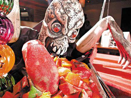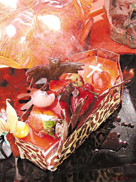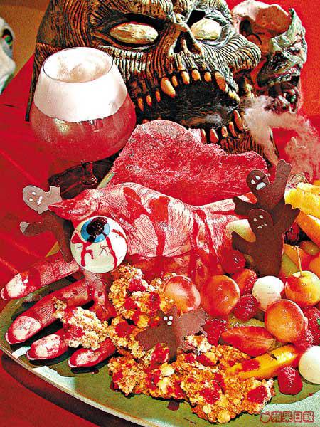朱古力做成的魔爪像真度極高,連皮膚的細紋和指甲也清楚可見。鮮血是士多啤梨汁。背後是用糖做成的冰塊,手上的肉碎是Tiramisu搓攔而成,一隻隻小鬼是朱古力,加上哈密瓜、士多啤梨、荔枝等水果,就成為這個恐怖核突的甜品。