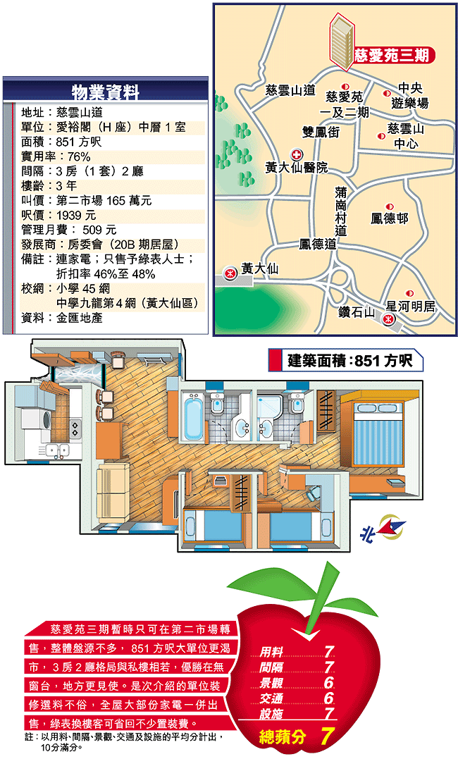 慈愛苑三期地勢最高,與一及二期樓齡差距3年,外貌亦有分野,尤其麻石電梯大堂及走廊最耀眼,加上屋苑近山,純住宅環境,特別幽靜,堪稱區內居屋樓王。該期僅提供663方呎間隔2房及851方呎間隔3房兩款單位。金匯地產何超明指出,第二市場成交集中細單位,大單位暫未錄成交,放盤亦不多,是次介紹的大單位開價165萬元,屬現有同類放盤的中價水平,其餘放盤叫價由150餘萬至180餘萬元不等。