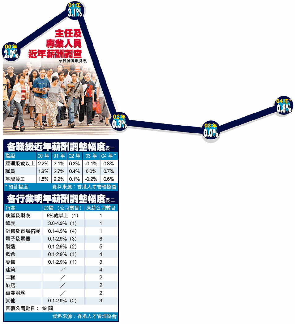 由多間大企業人力資源管理人員組成的「香港人才管理協會」及浸會大學永隆銀行國際商貿研究所,昨發表連續九年進行的香港薪酬及福利調查報告。調查在今年六至八月進行,詢問受訪公司由去年七月至今年六月員工薪酬調整資料,共有八十三間企業回覆,涉及四萬一千多名員工。當中不乏大企業如九巴、俊和集團、和記電訊、太古汽水廠、李錦記等。